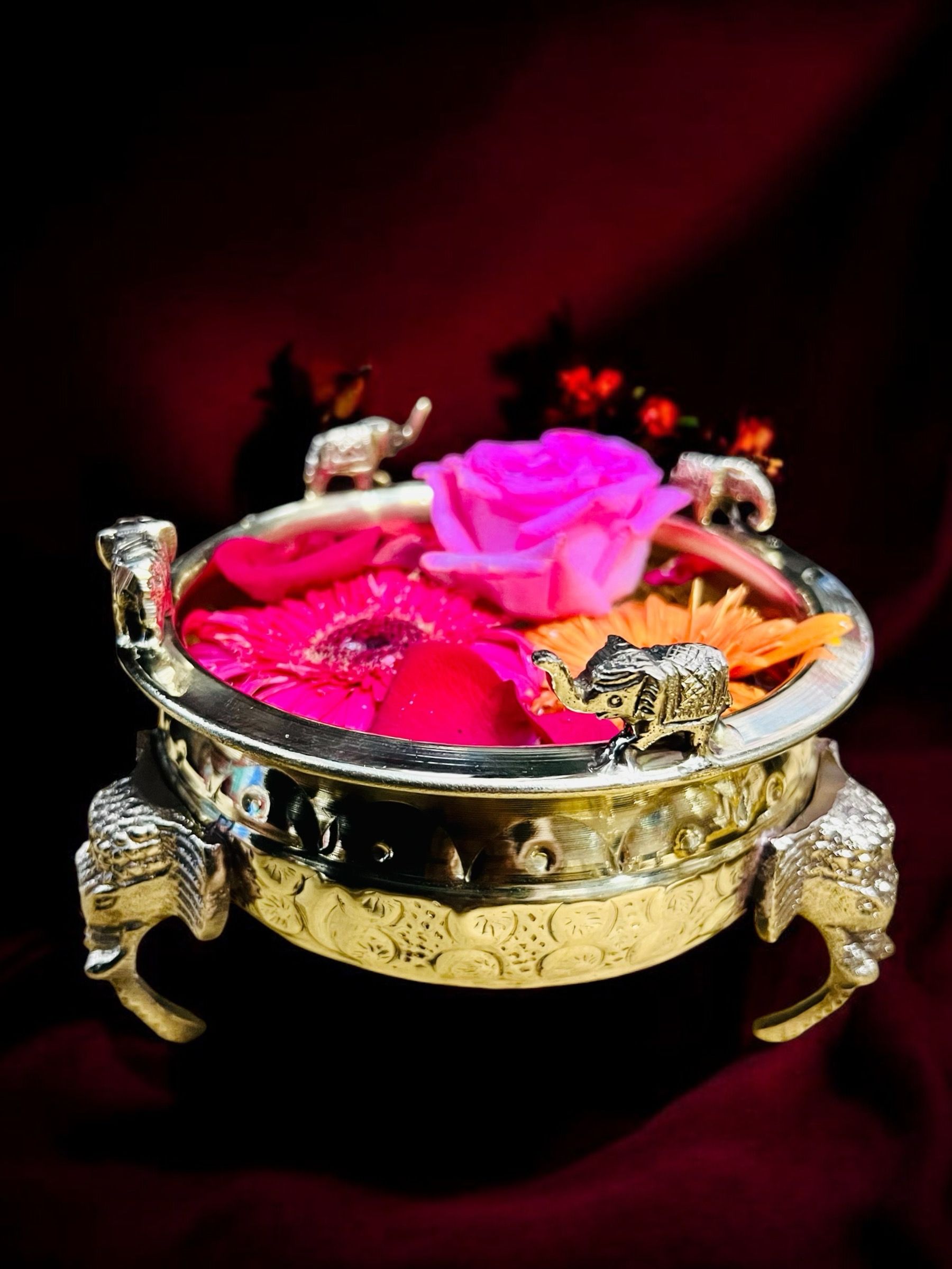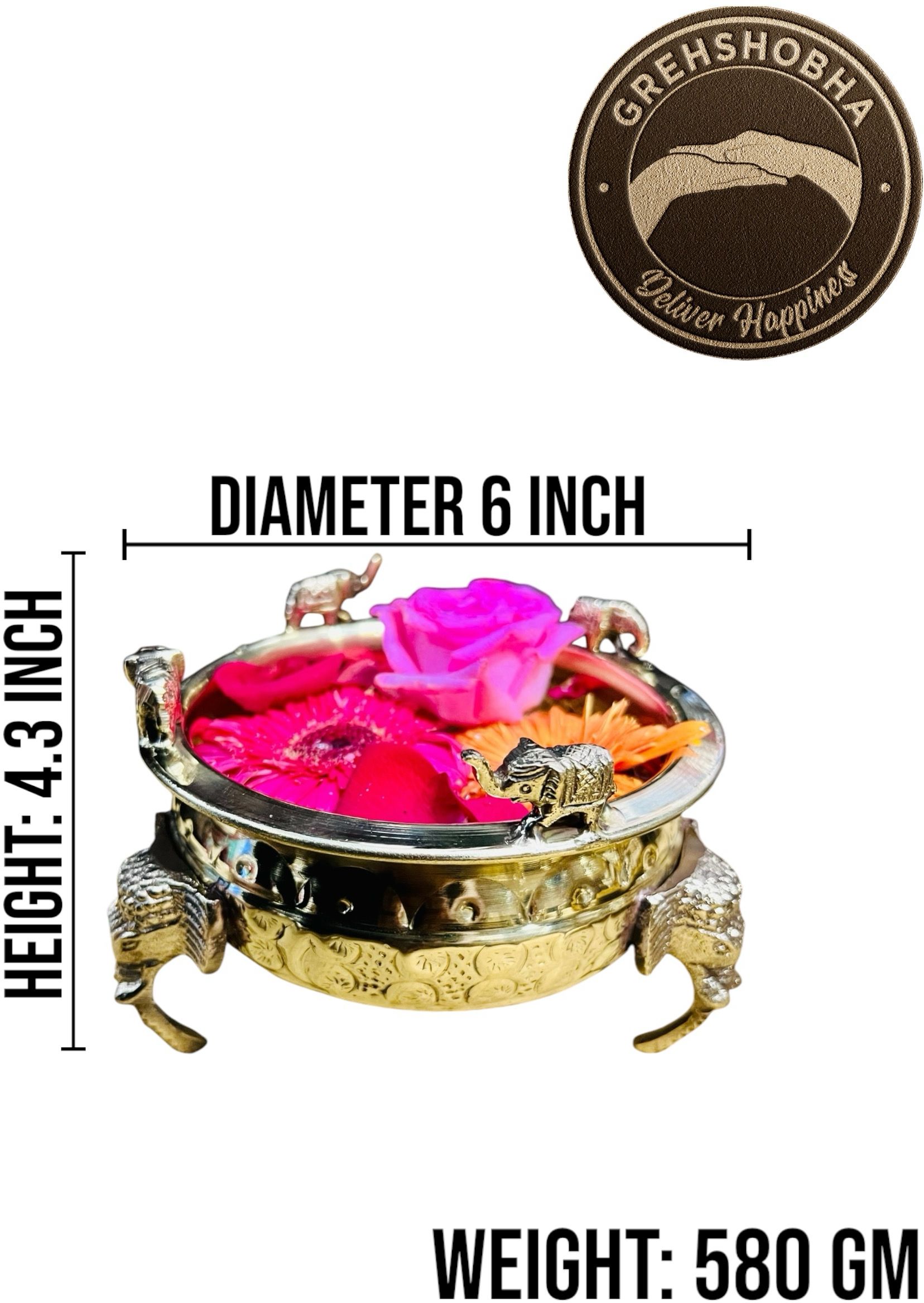 Grehshobha Brass Decorative Bowl Ethnic Carved Elephant Urli | Floating Flowers | Home Décor & Office Decoration (Pack of 1, Gold)