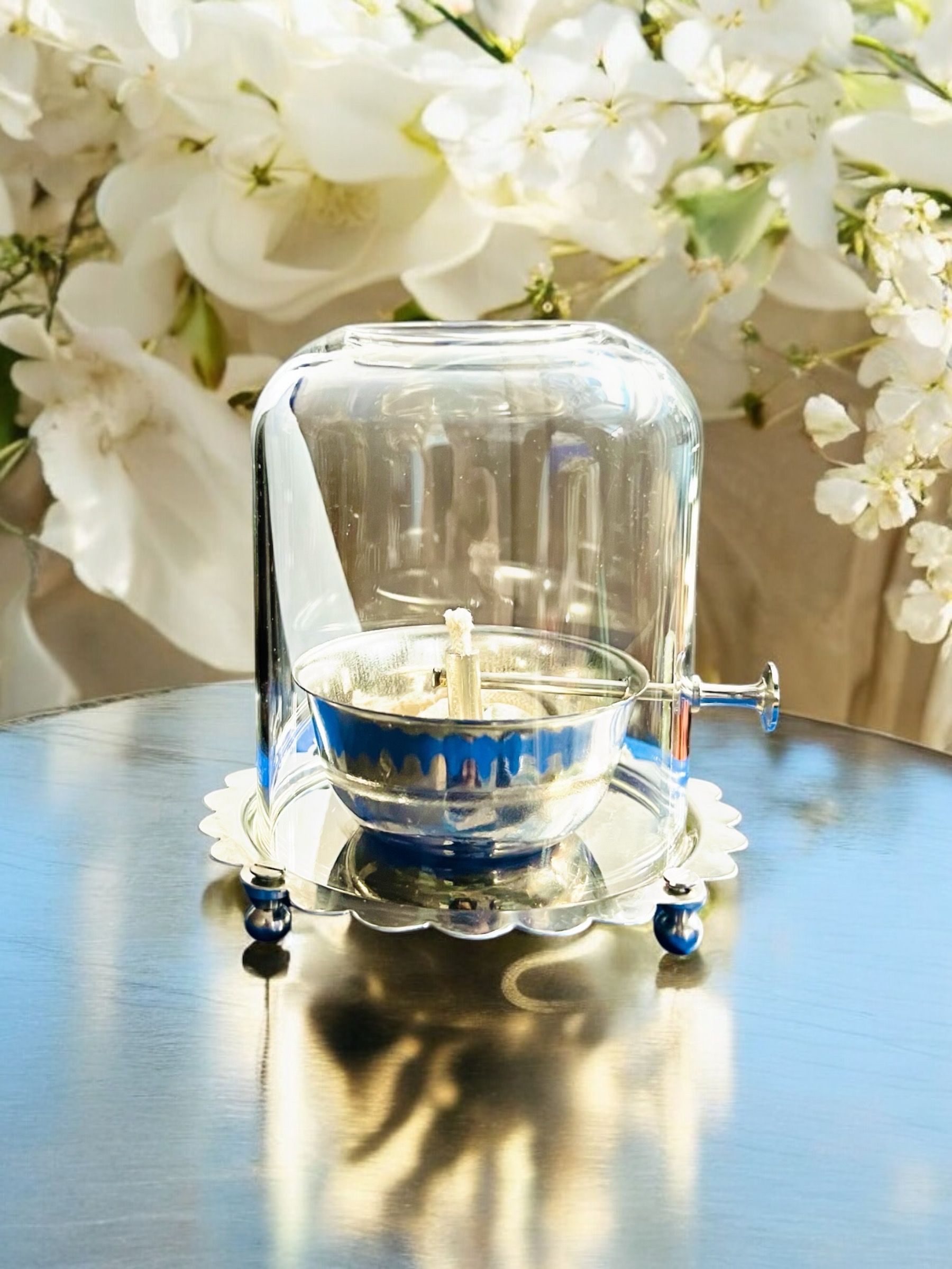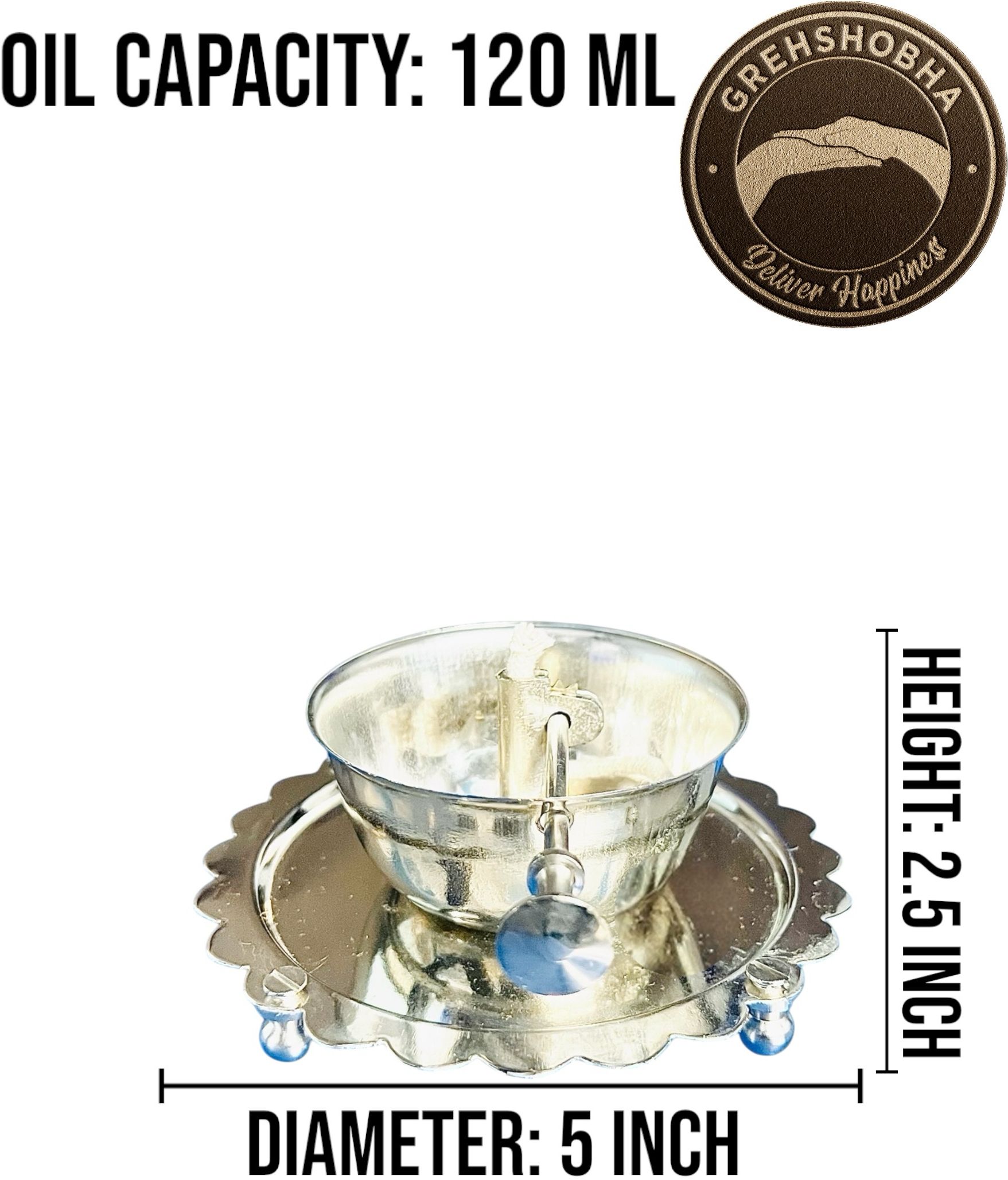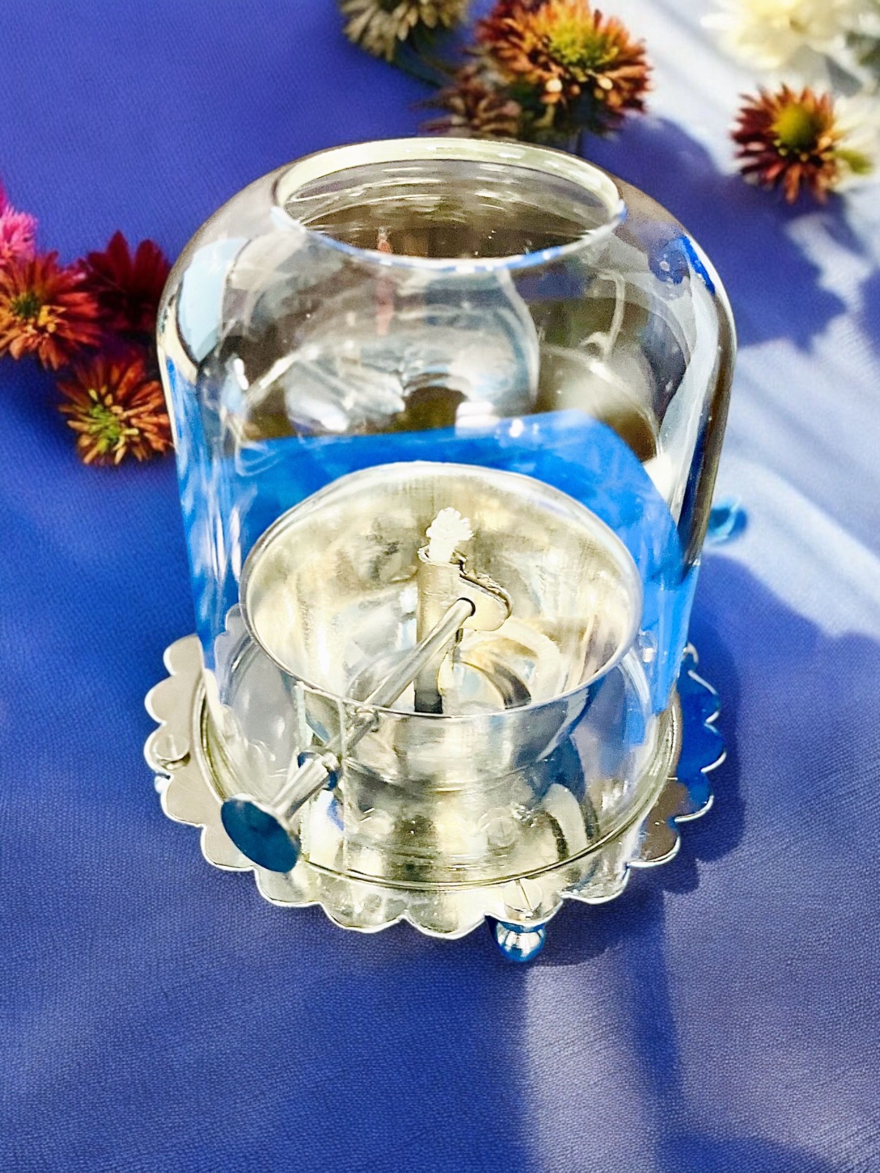 Grehshobha Durable Silver-Plated Akhand Jyot with Borosilicate Glass | 120 ml Oil Capacity Brass Table Diya Set (Height: 5.5 inch)
