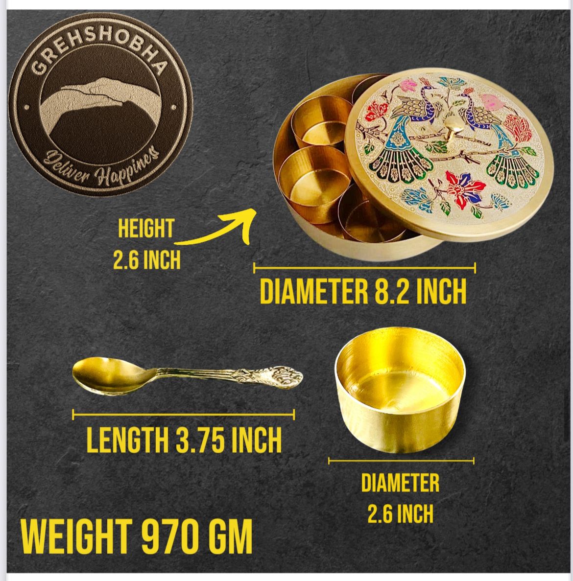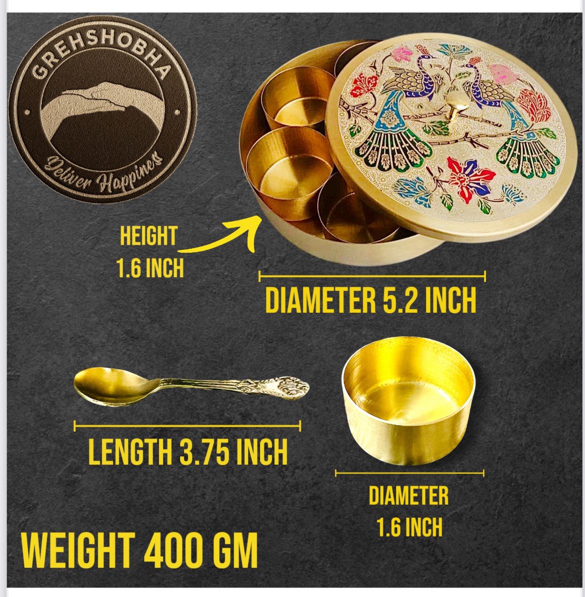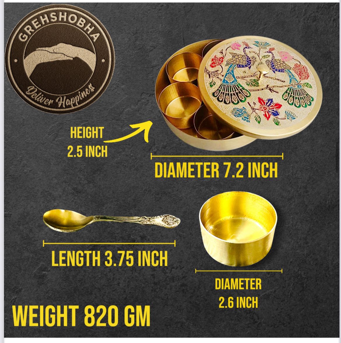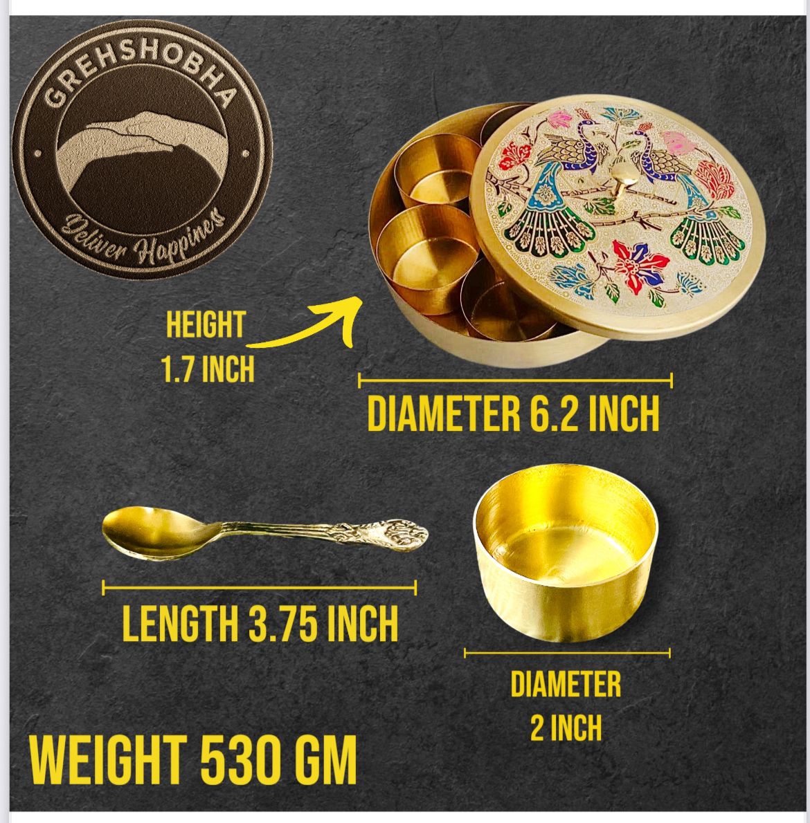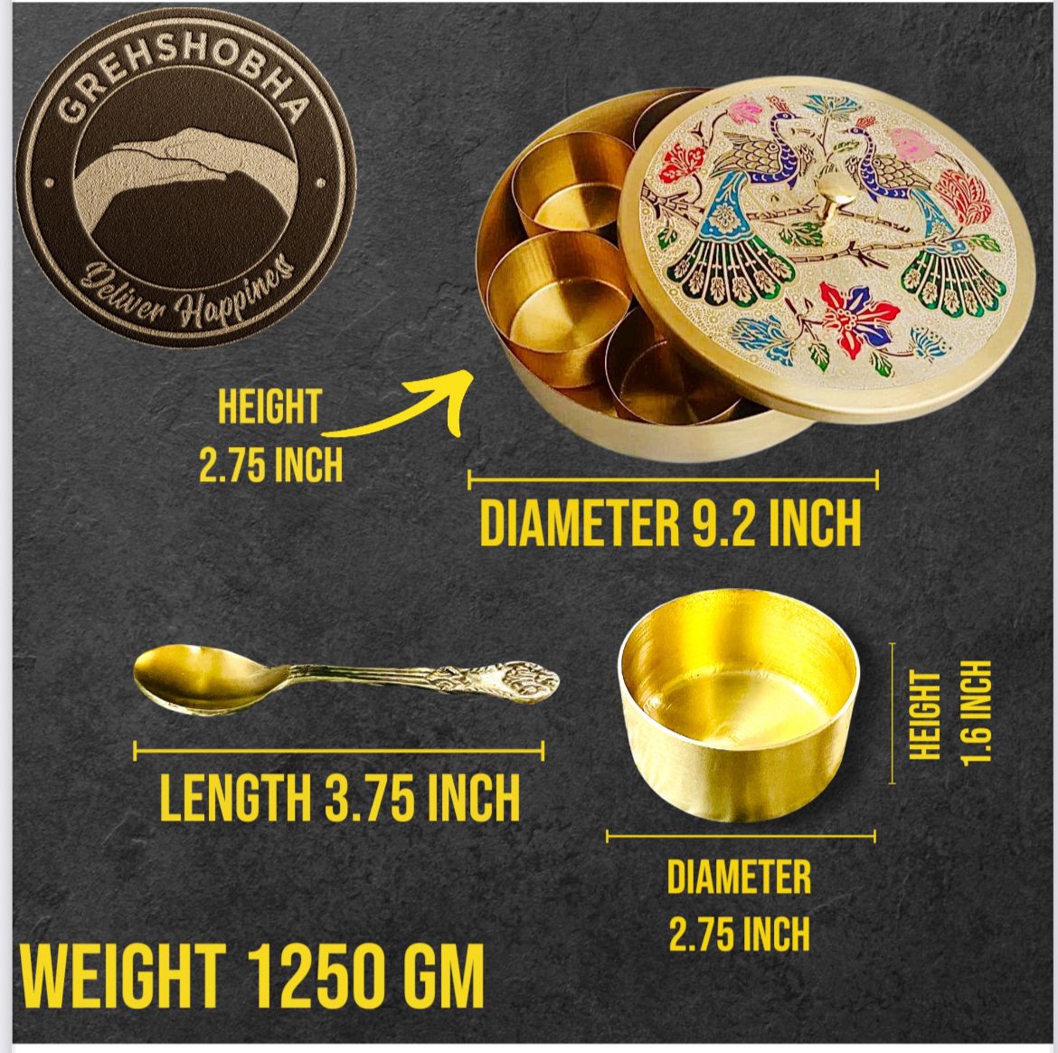 Pure Brass Round Masala Box Peacock Design | Traditional Spice Storage Container | Kitchen Essentials